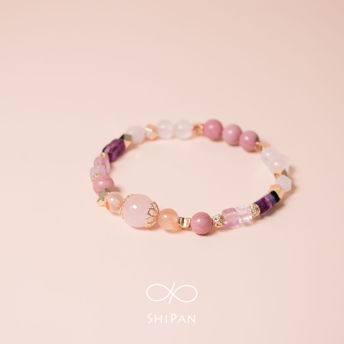 ✧粉水晶、薔薇輝石、橙黃瑪瑙、螢石、月光石