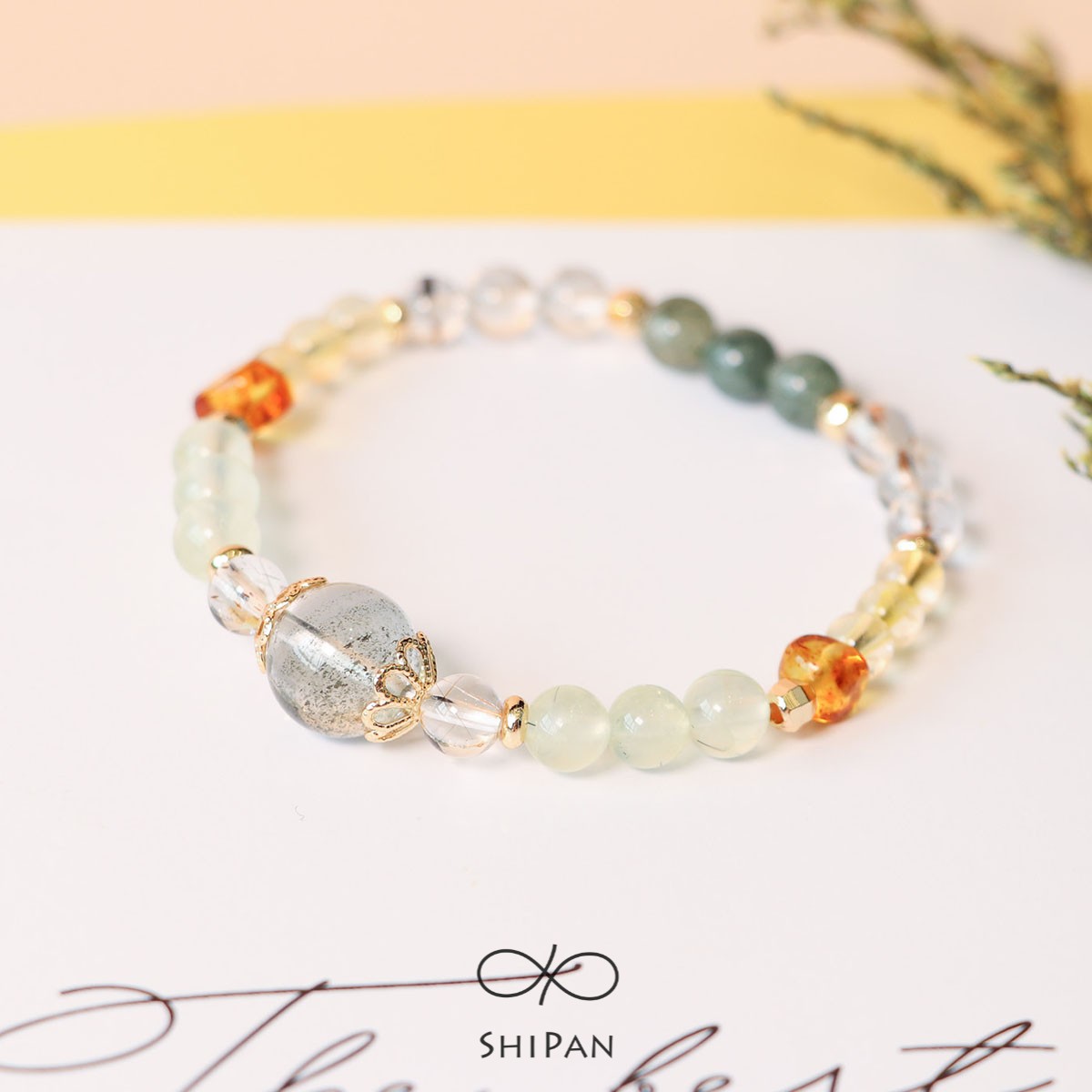 悠然原野✧綠幽靈葡萄石黃水晶琥珀黑金超七綠髮晶水晶手鍊