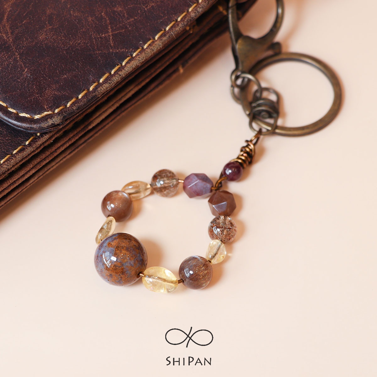 夕染光輝✧彼得石黑金超七黃水晶黑金太陽紅石榴水草瑪瑙鑰匙圈